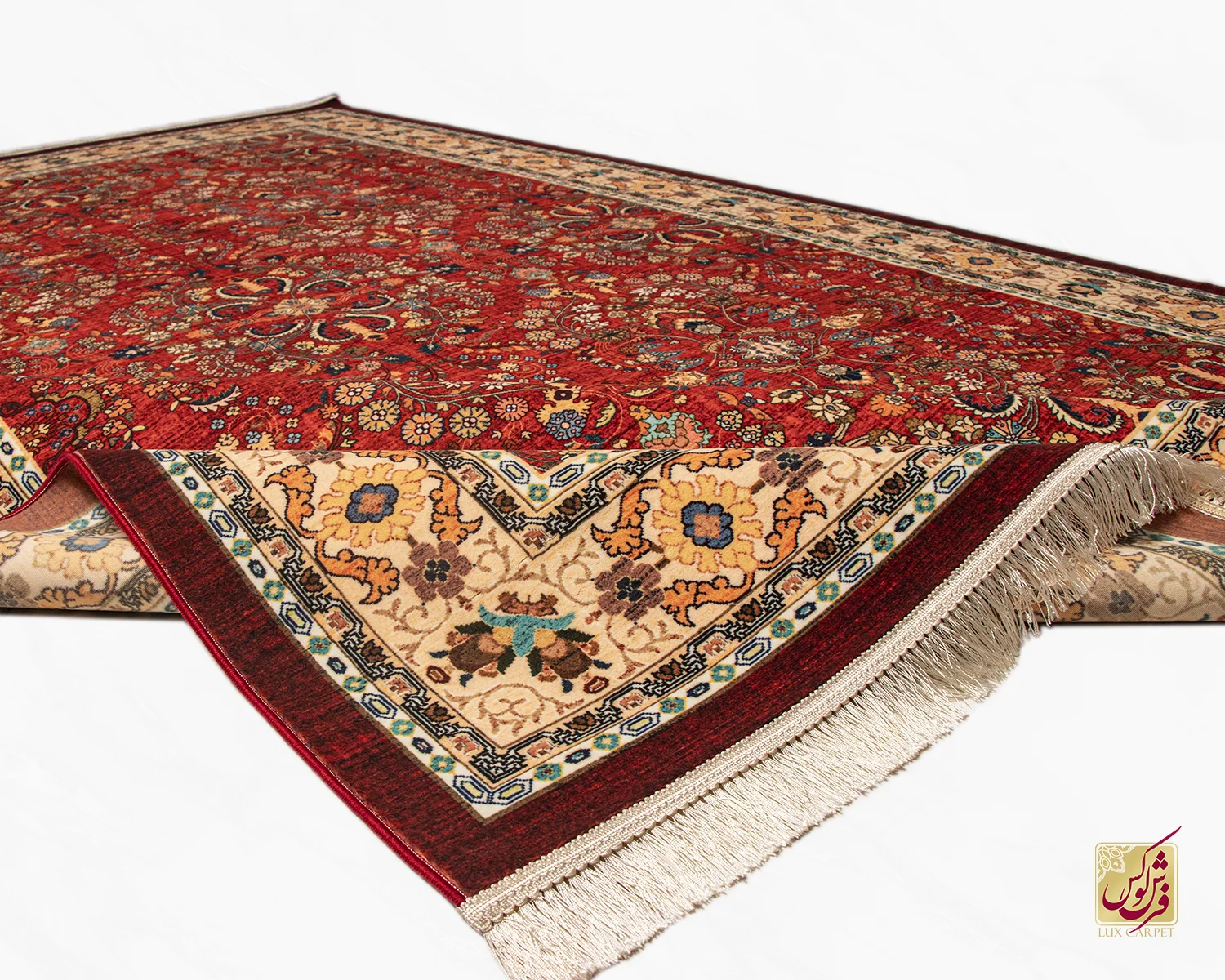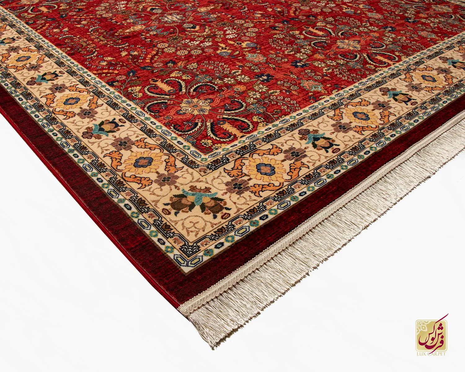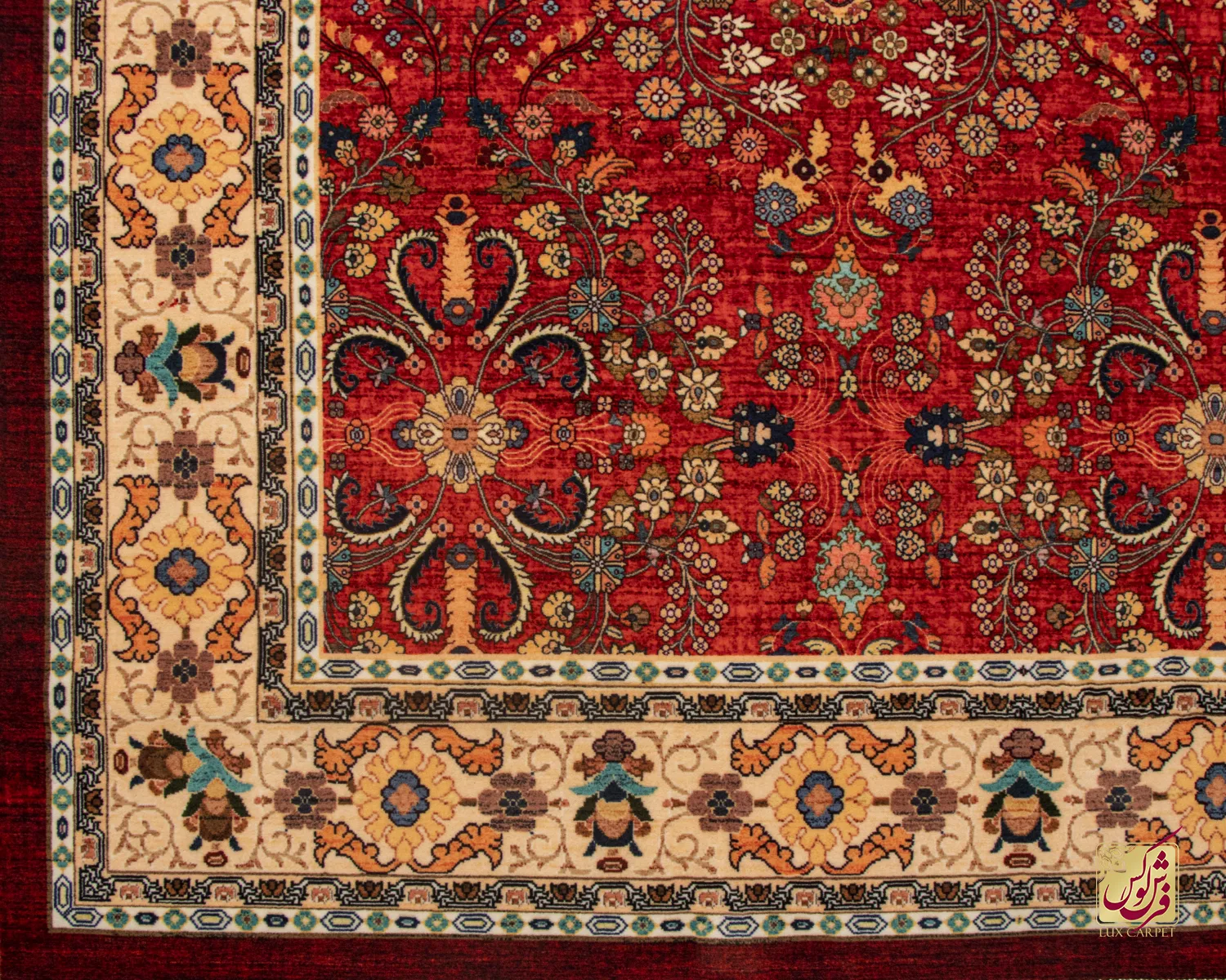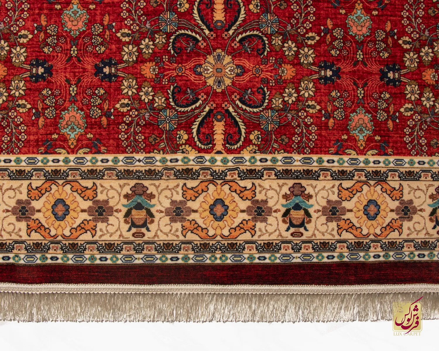 فرش ابریشم ماشینی ۲۰۲۷۳۸ لاکی حاشیه کرم