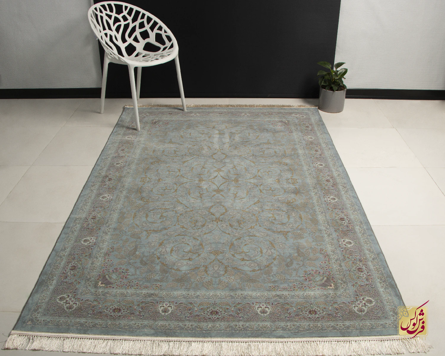 فرش ابریشم ماشینی ۷۰۲۵۵۰ فیروزهای طلایی