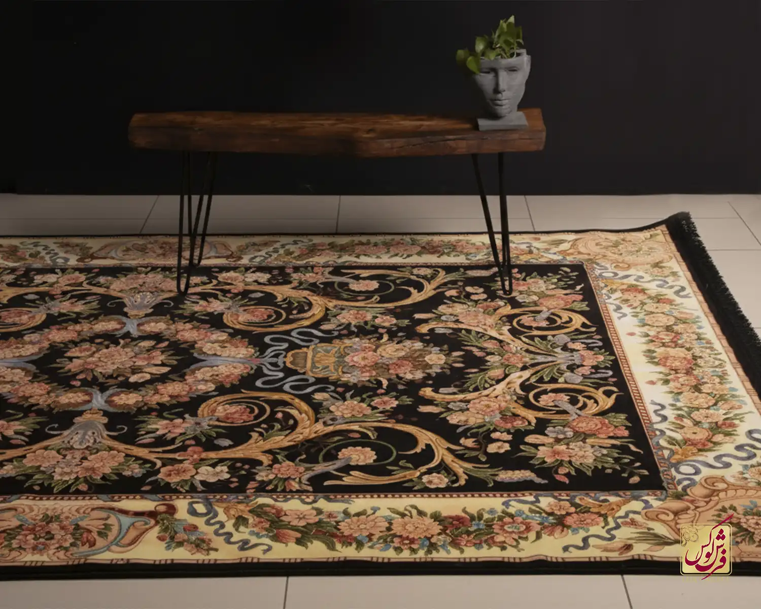 شناسـه محصـول: 2504فرش ابریشم ماشینی ۱۲۲۵ مشکی حاشیه نباتی